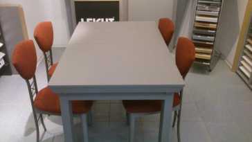 Hofmann Kulissen-Eßtisch 80 x 130 cm ausziehbar auf 290 cm in Buche massiv in quarzit/edlestahloptik lackiert mit 6 passenden Stühlen Polster rot, UPE 2.990,00 €, für nur Abholpreis 1.500,00 €, Ersparnis 1.490,00 €