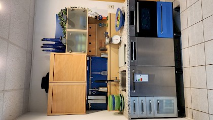 - Vielfältiges Zubehör und Küchenhelfer wie Töpfe, Bestecke und Kleingeräte